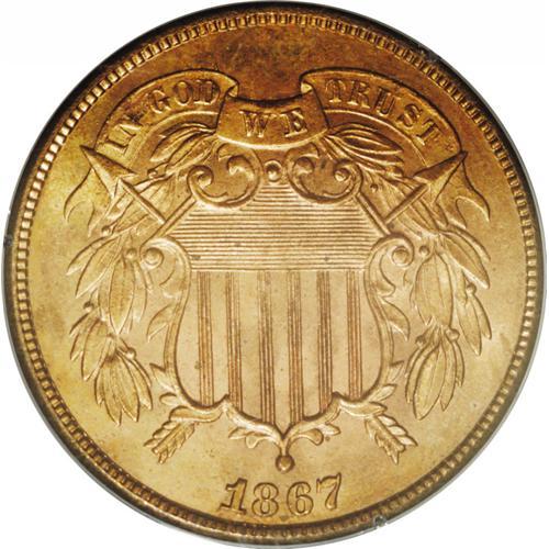 <B>1867<2C> MS65 Red PCGS.</B></I> Housed in a first-generation holder is a fully brilliant Gem example with frosty red luster on both sides. A few darker toning spots on each side can only be seen with close examination. This is a lovely two cent piece that is tied for the finest of its date to be certified.<BR><I>From The David L. Goodwin Collection.</B></I> <BR><BR><B>Important notice:</B> Heritage usually auctions material at the rate of 200-250 lots per hour. On some occasions eBay Live bid software or the Internet may not be able to keep up with the pace of the auction. We recommend placing a realistic absentee bid now as insurance to avoid disappointment. Occasionally the auctioneer may eliminate or reject an eBay Live bid, and the auctioneer may also reopen a lot after the close of the eBay live bidding (usually because we missed an audience bid), and may reject your bid even if it shows you as the winning bidder. By bidding via eBay Live, you agree that Heritage may award the lot to another bidder at its sole discretion under the circumstances described above or any other reasonable circumstances. Since eBay bids are not shown to us until we open the lot on the floor, we treat those bids just like floor bids. In most cases the floor responds before the eBay bid is presented to us, due to Internet lag time, so for consistency we have made it a policy that floor bids are always considered first over tie eBay live bids. Also please note that all Heritage lots purchased through eBay Live carry a 20% Buyer's Premium. Please make sure you read the Terms and Conditions before you bid. This lot is being auctioned in conjunction with a live floor auction by Heritage Galleries & Auctioneers. All final auction and invoice information will be supplied by Heritage Galleries & Auctioneers, and all other information should be considered preliminary. Lot:731 <BR><BR><B>Winning Notification and Billing:</B> After the FINAL session in this auction is complete, Heritage will send e-mail and snail mail invoices. This process normally takes several days. All final auction and invoice information will be supplied by Heritage Galleries & Auctioneers, and all other information should be considered preliminary. <BR><BR>This auction will be conducted on a live auction floor and over the Internet through eBay Live. If you choose to place an absentee bid, please take a moment to <font color='#0000ff'><u><a href='http://pages.ebay.com/liveauctions/help/before/laabsentee.html'>learn how eBay Live absentee bidding works</a></u></font><font color='#000000'>