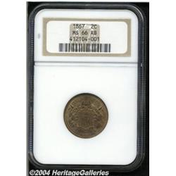 <B>1867<2C> MS66 Red and Brown NGC.</B></I> A crisply struck premium Gem with pleasing cartwheel luster and unmarked surfaces. Mostly pale gold in color, although the central reverse offers wisps of lavender patina. Population: 10 in 66 Red and Brown, none finer (7/03). <BR><BR><B>Important notice:</B> Heritage usually auctions material at the rate of 200-250 lots per hour. On some occasions eBay Live bid software or the Internet may not be able to keep up with the pace of the auction. We recommend placing a realistic absentee bid now as insurance to avoid disappointment. Occasionally the auctioneer may eliminate or reject an eBay Live bid, and the auctioneer may also reopen a lot after the close of the eBay live bidding (usually because we missed an audience bid), and may reject your bid even if it shows you as the winning bidder. By bidding via eBay Live, you agree that Heritage may award the lot to another bidder at its sole discretion under the circumstances described above or any other reasonable circumstances. Since eBay bids are not shown to us until we open the lot on the floor, we treat those bids just like floor bids. In most cases the floor responds before the eBay bid is presented to us, due to Internet lag time, so for consistency we have made it a policy that floor bids are always considered first over tie eBay live bids. Also please note that all Heritage lots purchased through eBay Live carry a 20% Buyer's Premium. Please make sure you read the Terms and Conditions before you bid. </span></font></tr></table></td></tr></table>