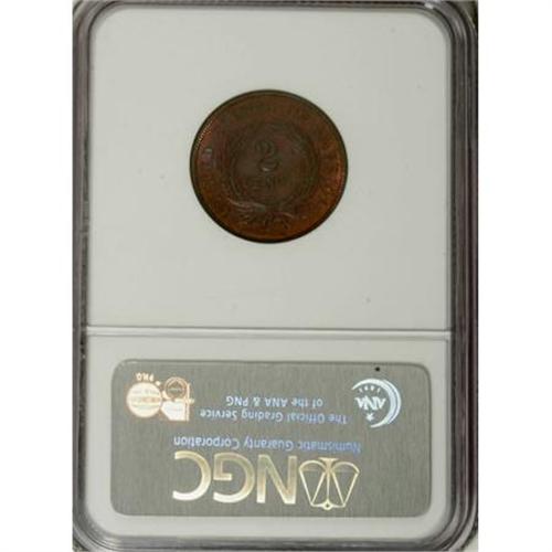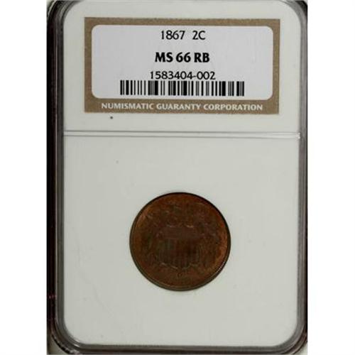 <B>1867 2C MS66 Red and Brown NGC.</B></I> Production of two cent pieces fell from the outset, and in 1867, Philadelphia struck fewer than 3 million of the coins. This attentively struck example, luminous with dusky pumpkin-orange and rosewood surfaces, offers incredible eye appeal. Census: 12 in 66 Red and Brown, 0 finer (10/07).<BR><BR><B>Coin Engraver:</B> James B. Longacre<BR><BR><b>Shipping:</b> Coins & Currency (<a target="_blank" href="http://www.heritageauctions.com/common/shipping.php">view shipping information</a>)