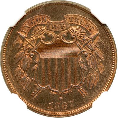 1867 Two Cents. NGC graded Proof 65 Red. Nice red colors. 625+ Proofs struck. Fiery-red color covers the fields of this handsome two-cent piece, in point of fact. In addition, the devices were struck with the requisite force and energy by the highly polished Proof dies to insure that all design elements show boldly. In a new 4 pronged NGC holder. Pop 8; 5 finer.