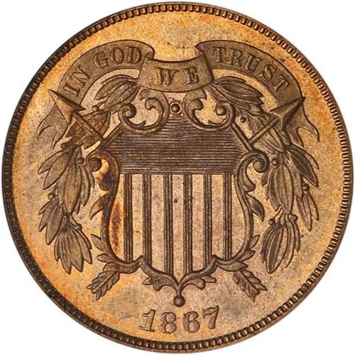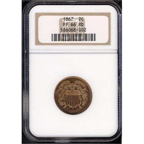 <b>1867 Two Cents. NGC graded PF66 R.</b> A superlative gem in all respects. The luster is never ending, the orange and gold highlights vie with each other for dominance atop the nicely mirrored field, while the strike is essentially as sharp as a Proof will ever be for the date. Regarding this date, the clearest details are found throughout the shield lines as well as on the leaves in both sets of wreaths, obverse and reverse, and also encompassing the key date digits which are crystal clear. Only 625 Proofs minted in 1867 <b>(PCGS # 3635)</b> <i>