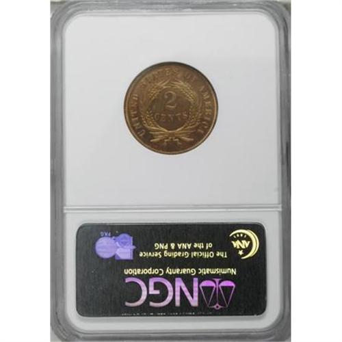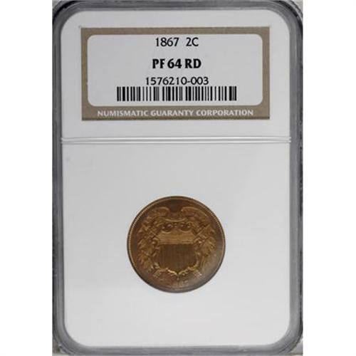 <B>1867 2C PR64 Red NGC.</B></I> Rich pumpkin-orange color is noted on both sides of this highly reflective near-Gem proof. The luster is full and while there are a few minor marks here and there, they are not distracting and the eye appeal is overwhelmingly positive. Unusual in its vibrancy of color.<BR><BR><B>Coin Engraver:</B> James B. Longacre<BR><BR><b>Shipping:</b> Coins & Currency (<a target="_blank" href="http://www.heritageauctions.com/common/shipping.php">view shipping information</a>)