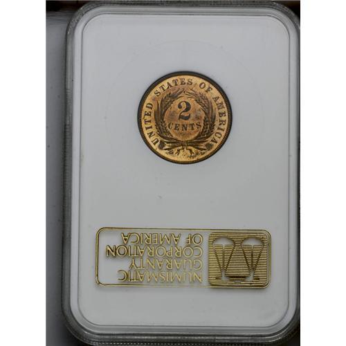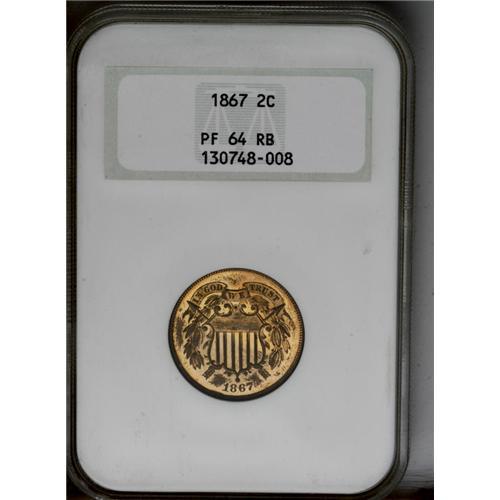 <B>1867<2C> PR64 Red and Brown NGC.</B></I> Light gold and orange-rose hues predominate, although the margins have small areas of russet-brown toning. Pinpoint-sharp and pleasing. Housed in an early generation holder. Only 625+ proofs were struck.