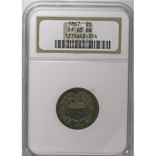 <B>1867 2C PR65 Brown NGC.</B></I> Boldly impressed and luminous. The obverse has scarcely faded from its original color, though the reverse has pumpkin-brown surfaces. Contact is noted on the left (facing) arrowhead. Census: 15 in 65 Brown, 8 finer (8/06).<BR><I>From The Jones Beach Collection.</B></I><BR><BR><b>Shipping:</b> Coin/Currency (<a target="_blank" href="http://www.heritageauctions.com/common/shipping.php">view shipping information</a>)