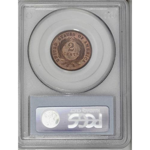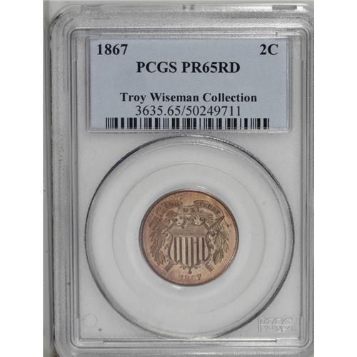 <B>1867<2C> PR65 Red PCGS.</B></I> Evenly matched sunset-gold and copper hues grace each side of this delectable Gem. Trifling carbon flecks can be seen only with a loupe, but they do not detract from the enormous eye appeal. The generous strike also provides full venation to the left-side obverse leaves.<BR><I>From The Troy Wiseman Collection.</B></I>