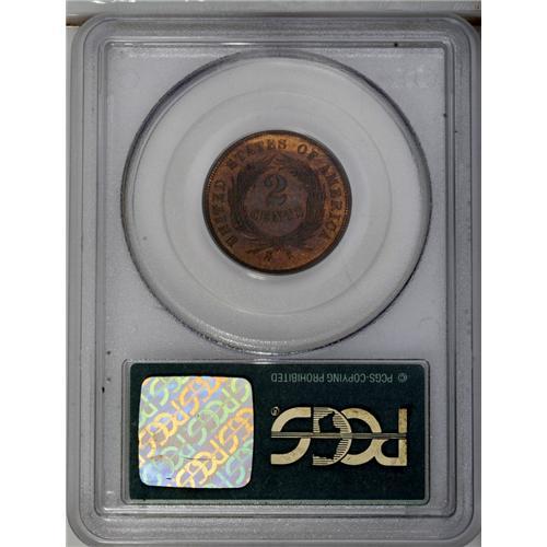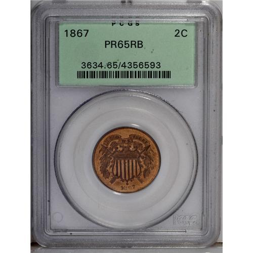 <B>1867<2C> PR65 Red and Brown PCGS.</B></I> The obverse is almost fully Red, though the reverse has medium brown in the wreath and red at the periphery. Nicely detailed with a few flecks of carbon.<BR><I>From The Antigo Collection.</B></I>