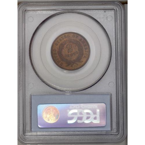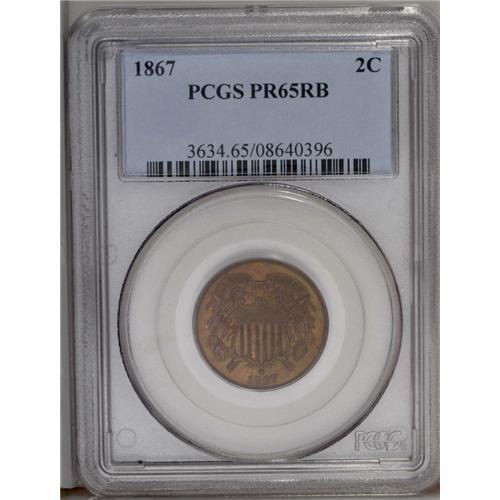 <B>1867<2C> PR65 Red and Brown PCGS.</B></I> This Gem Proof is more Brown than Red, though enough original orange-copper color remains to keep it in the color category. The walnut-toned fields are quite clean for the grade.