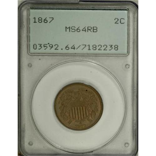 <B>1867 2C MS64 Red and Brown PCGS.</B></I> PCGS Population (152/50). NGC Census: (80/85). Mintage: 2,938,750. Numismedia Wsl. Price for NGC/PCGS coin in MS64: $300. (#3592)<BR><BR><B>Coin Engraver:</B> James B. Longacre<BR><BR><b>Shipping:</b> Coins & Currency (<a target="_blank" href="http://www.heritageauctions.com/common/shipping.php">view shipping information</a>)