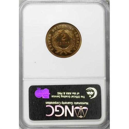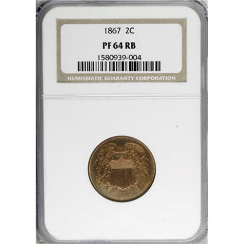 <B>1867 2C PR64 Red and Brown NGC.</B></I> NGC Census: (33/57). PCGS Population (62/53). Mintage: 625. Numismedia Wsl. Price for NGC/PCGS coin in PR64: $525. (#3634)<BR><BR><B>Coin Engraver:</B> James B. Longacre<BR><BR><b>Shipping:</b> Coins & Currency (<a target="_blank" href="http://www.heritageauctions.com/common/shipping.php">view shipping information</a>\)