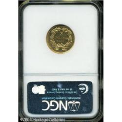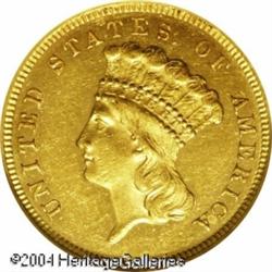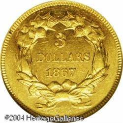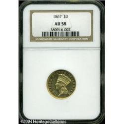 1867 $3 AU58 NGC. Fewer than 250 1867 Three Dollar <B>1867 $3 AU58 NGC.</B></I> Fewer than 250 1867 Three Dollar gold pieces are believed extant out of the paltry original mintage of 2,600 business strikes. This coin displays only light, even wear across the highest points with no individually mentionable distractions. Attractively shaded in golden-rose hues. <BR><BR><B>Important notice:</B> Heritage usually auctions material at the rate of 200-250 lots per hour. On some occasions eBay Live bid software or the Internet may not be able to keep up with the pace of the auction. We recommend placing a realistic absentee bid now as insurance to avoid disappointment. Occasionally the auctioneer may eliminate or reject an eBay Live bid, and the auctioneer may also reopen a lot after the close of the eBay live bidding (usually because we missed an audience bid), and may reject your bid even if it shows you as the winning bidder. By bidding via eBay Live, you agree that Heritage may award the lot to another bidder at its sole discretion under the circumstances described above or any other reasonable circumstances. Since eBay bids are not shown to us until we open the lot on the floor, we treat those bids just like floor bids. In most cases the floor responds before the eBay bid is presented to us, due to Internet lag time, so for consistency we have made it a policy that floor bids are always considered first over tie eBay live bids. Also please note that all Heritage lots purchased through eBay Live carry a 20% Buyer's Premium. Please make sure you read the Terms and Conditions before you bid. This lot is being auctioned in conjunction with a live floor auction by Heritage Galleries & Auctioneers. All final auction and invoice information will be supplied by Heritage Galleries & Auctioneers, and all other information should be considered preliminary. Lot:6602