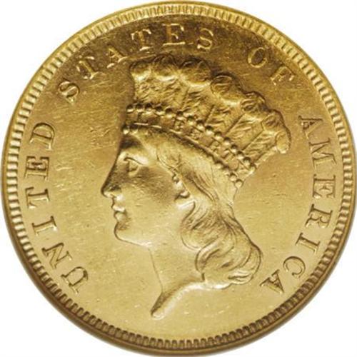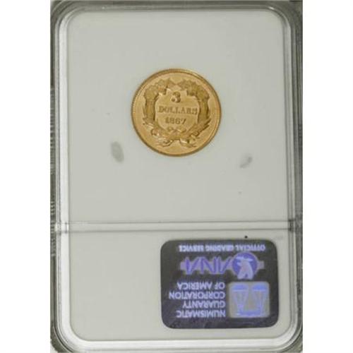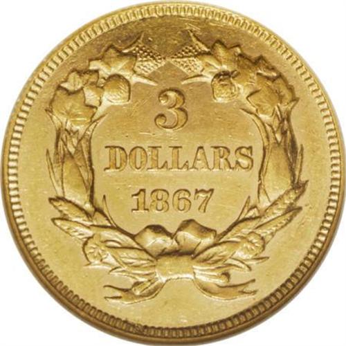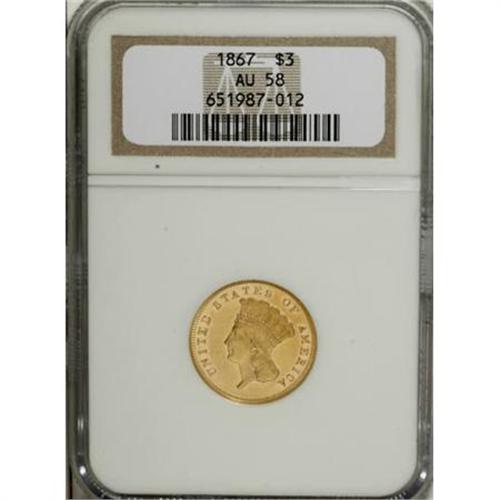 <B>1867 $3 AU58 NGC.</B></I> Despite its odd-denomination status, the three dollar gold piece had business strikes in 33 years of its 35-year history, even though most of those issues had nominal mintages. This 1867 piece is one of just 2,600 examples coined in its year. Well-defined with flashy, reflective luster and lightly abraded yellow-gold surfaces. A touch of friction appears on the portrait. Census: 41 in 58, 22 finer (6/07).<BR><I>From The DAX Collection.</B></I><BR><BR><B>Coin Engraver:</B> James B. Longacre<BR><BR><b>Shipping:</b> Coins & Currency (<a target="_blank" href="http://www.heritageauctions.com/common/shipping.php">view shipping information</a>\)