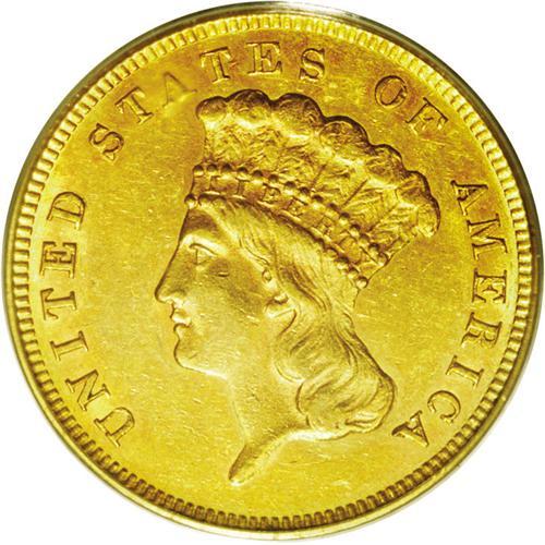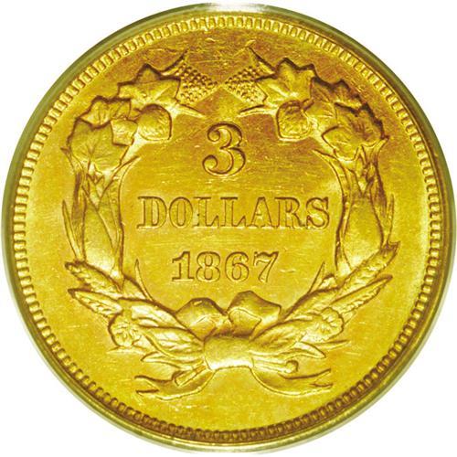 <B>1867<$3> AU58 PCGS.</B></I> All of the three dollar gold issues from the 1860s are quite scarce and the 1867, one of just 2,600 business strikes produced, is certainly no exception. Both sides of this mildly reflective example are draped in reddish patina and are kept from Mint State status by the slightest trace of friction on the highpoints. Population: 7 in 58, 20 finer (4/06).