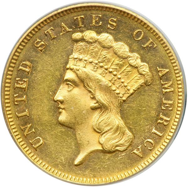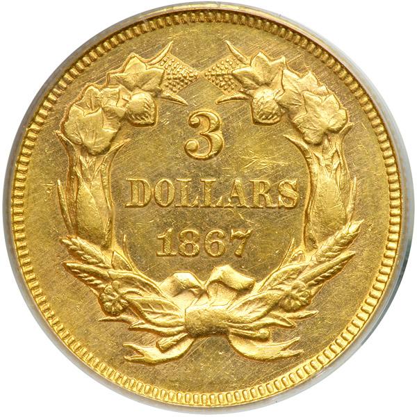 1867. PCGS graded AU-58 CAC Approved. A great looking example and loaded with reflective mint luster. Has only a bit of roughness in the field above ARS on the reverse. Very close to full Mint State. Only 2600 struck. Pop 9; 19 finer. 2900 (PCGS # 7988) .