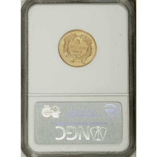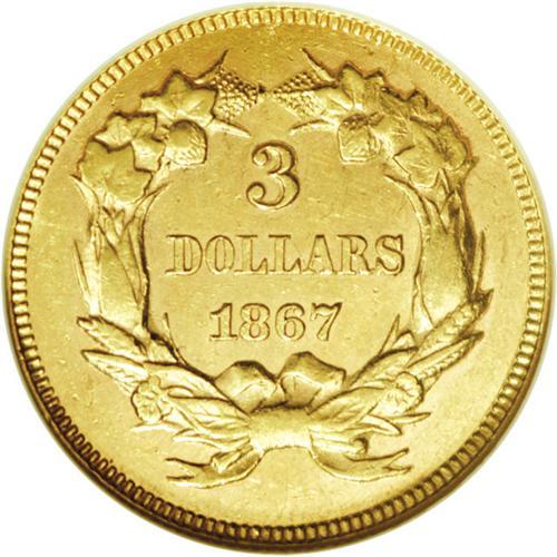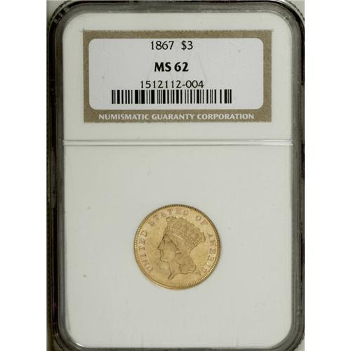 <B>1867 $3 MS62 NGC.</B></I> Bright yellow-gold surfaces exhibit partially prooflike fields and die polish lines, particularly in the protected areas, that are typically seen on this low mintage issue (2,600 business strikes). Excellent definition appears on the design elements. Light contact evenly scattered over both sides prevent a higher grade. Rare in Mint State; only 42 examples have been seen in Uncirculated grades by NGC and PCGS. Census: 7 in 62, 4 finer (12/06).<BR><BR><b>Shipping:</b> Coins & Currency (<a target="_blank" href="http://www.heritageauctions.com/common/shipping.php">view shipping information</a>)