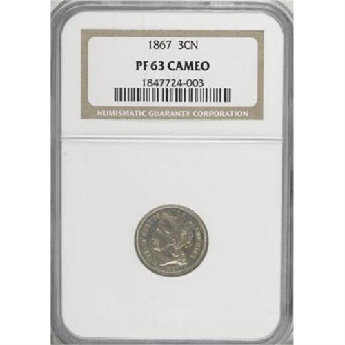 <B>1867 3CN PR63 Cameo NGC.</B></I> NGC Census: (1/54). PCGS Population (1/44). (#83763)<BR><BR><b>Shipping:</b> Coins & Currency (<a target="_blank" href="http://www.heritageauctions.com/common/shipping.php">view shipping information</a>)
