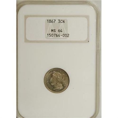 <B>1867 3CN MS64 NGC.</B></I> NGC Census: (147/42). PCGS Population (138/50). Mintage: 3,915,000. Numismedia Wsl. Price for NGC/PCGS coin in MS64: $205. (#3733)<BR><BR><B>Coin Engraver:</B> James B. Longacre<BR><BR><b>Shipping:</b> Coins & Currency (<a target="_blank" href="http://www.heritageauctions.com/common/shipping.php">view shipping information</a>)