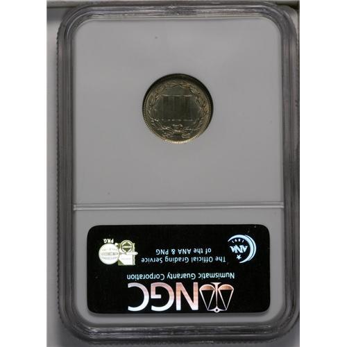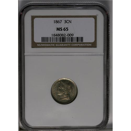 <B>1867<3CN> MS65 NGC.</B></I> This satiny Gem's dove-gray surfaces have accents of violet and gold. Die clashing is evident on both the softly struck obverse and reverse.<BR><I>From The Redfjord Collection.</B></I>
