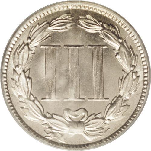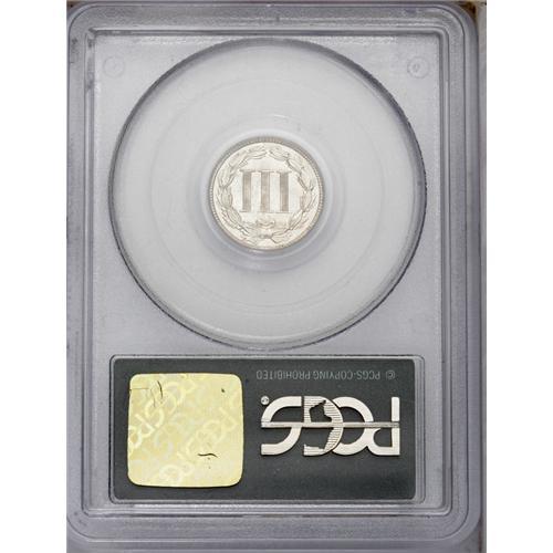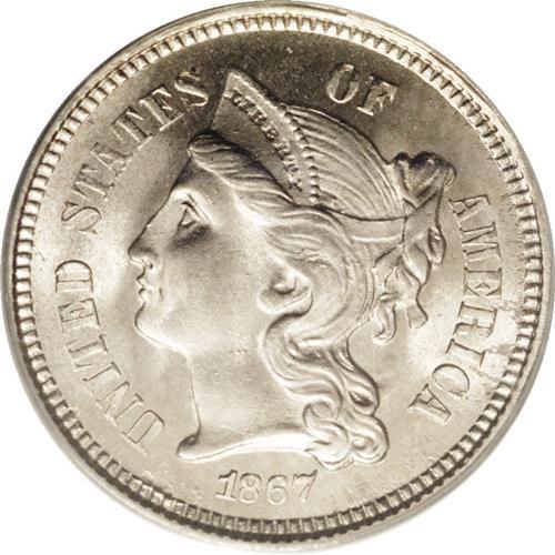 <B>1867<3CN> MS66 PCGS.</B></I> The 1867 is seldom found in the better grades of Uncirculated, even though 3.9 million pieces were minted. This is a mostly brilliant coin that is well defined, but the obverse shows numerous small planchet flakes around the perimeter. Housed in an earlier PCGS holder with a green insert. Population: 7 in 66, 0 finer (1/06).