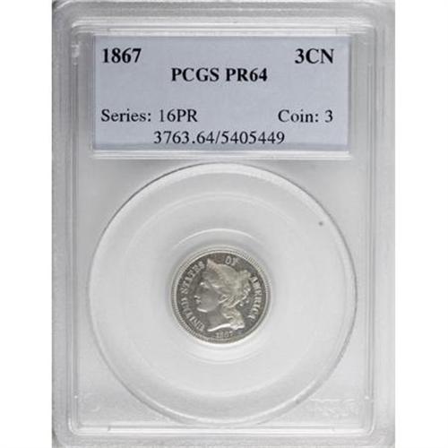 <B>1867 3CN PR64 PCGS.</B></I> PCGS Population (91/65). NGC Census: (75/67). Mintage: 625. Numismedia Wsl. Price for NGC/PCGS coin in PR64: $500. (#3763)<BR><BR><B>Coin Engraver:</B> James B. Longacre<BR><BR><b>Shipping:</b> Coins & Currency (<a target="_blank" href="http://www.heritageauctions.com/common/shipping.php">view shipping information</a>\)