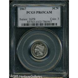 <B>1867 3CN PR65 Cameo PCGS.</B></I> Ample frost appears on the central devices and roller marks can still be seen over parts of the planchet. The fields remain deeply reflective and undistracted by toning. Lot:5780