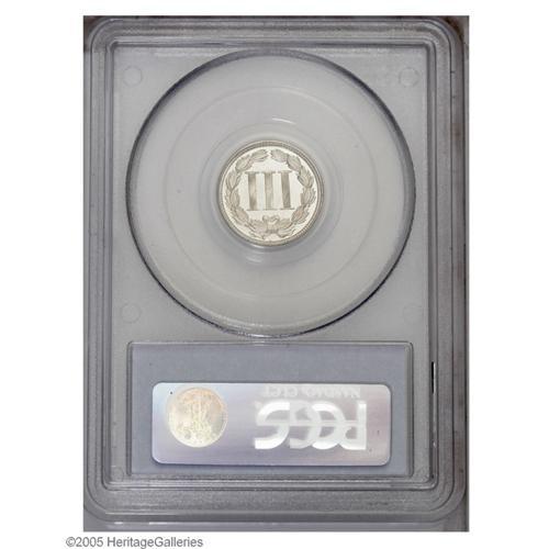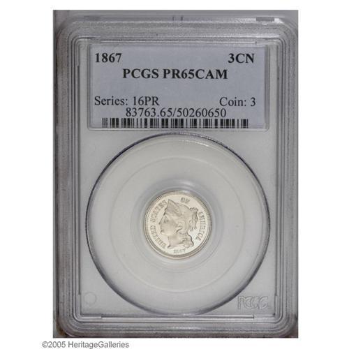 <B>1867<3CN> PR65 Cameo PCGS.</B></I> This flashy proof is virtually untoned, and displays sharply struck design elements. Light roller marks are noted on Liberty's motif, as well as a small planchet void on the cheek. Population: 10 in 65, 14 finer (9/05).