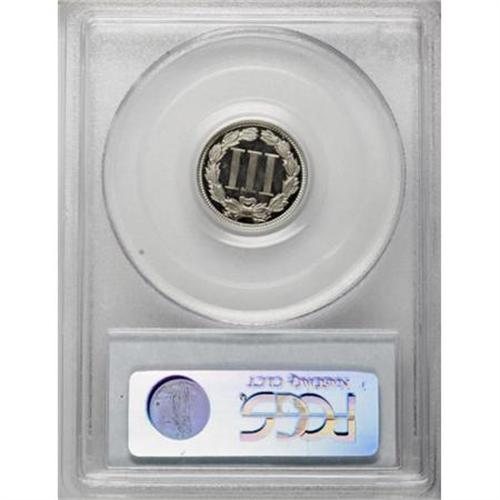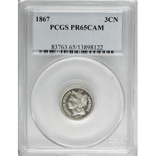 <B>1867 3CN PR65 Cameo PCGS.</B></I> This lovely Gem displays cameo contrast which is unimprovably strong on both sides. The design details are completely struck and the surfaces are impeccably preserved. The 1867 is a very scarce and sought-after issue in the proof three cent nickel series. Population: 13 in 65 Cameo, 17 finer (6/07). <BR><BR><b>Shipping:</b> Coins & Currency (<a target="_blank" href="http://www.heritageauctions.com/common/shipping.php">view shipping information</a>)