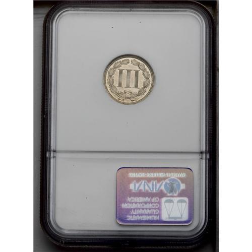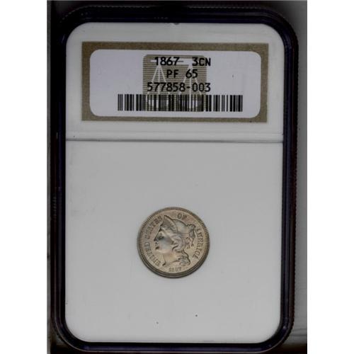 <B>1867<3CN> PR65 NGC.</B></I> Enticing Gem proof, with light violet patina and some very faint die polish lines noted under close inspection. The design elements are sharply struck throughout. Census: 52 in 65, 16 finer (3/06). <BR><BR><B>Important notice:</B> Heritage usually auctions material at the rate of 200-250 lots per hour. On some occasions eBay Live bid software or the Internet may not be able to keep up with the pace of the auction. We recommend placing a realistic absentee bid now as insurance to avoid disappointment. Occasionally the auctioneer may eliminate or reject an eBay Live bid, and the auctioneer may also reopen a lot after the close of the eBay live bidding (usually because we missed an audience bid), and may reject your bid even if it shows you as the winning bidder. By bidding via eBay Live, you agree that Heritage may award the lot to another bidder at its sole discretion under the circumstances described above or any other reasonable circumstances. Since eBay bids are not shown to us until we open the lot on the floor, we treat those bids just like floor bids. In most cases the floor responds before the eBay bid is presented to us, due to Internet lag time, so for consistency we have made it a policy that floor bids are always considered first over tie eBay live bids. Also please note that all Heritage lots purchased through eBay Live carry a 20% Buyer's Premium. Please make sure you read the Terms and Conditions before you bid. This lot is being auctioned in conjunction with a live floor auction by Heritage Galleries & Auctioneers. All final auction and invoice information will be supplied by Heritage Galleries & Auctioneers, and all other information should be considered preliminary. Lot:794 <BR><BR><B>Winning Notification and Billing:</B> After the FINAL session in this auction is complete, Heritage will send e-mail and snail mail invoices. This process normally takes several days. All final auction and invoice information will be supplied by Heritage Galleries & Auctioneers, and all other information should be considered preliminary. <BR><BR>This auction will be conducted on a live auction floor and over the Internet through eBay Live. If you choose to place an absentee bid, please take a moment to <font color='#0000ff'><u><a href='http://pages.ebay.com/liveauctions/help/before/laabsentee.html'>learn how eBay Live absentee bidding works</a></u></font><font color='#000000'>