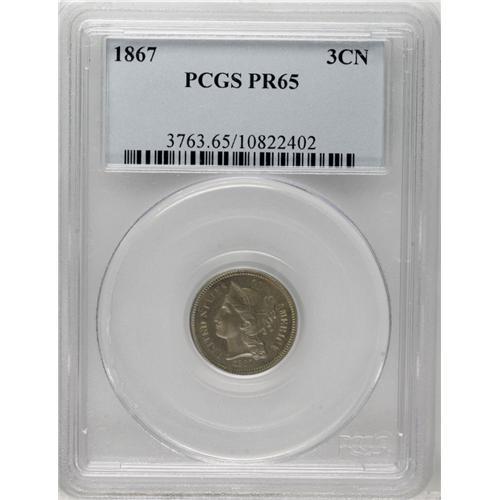 1867 3CN PR65 PCGS. An obvious Gem proof with excellen
