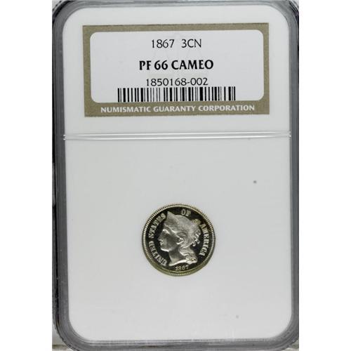 <B>1867 3CN PR66 Cameo NGC.</B></I> An estimated 625 proofs were struck of the 1867 three cent nickel. This is an exceptionally pleasing example whose surfaces are almost brilliant except for the slightest hint of peripheral golden color on each side. The devices are noticeably frosted and contrast strongly against the deeply reflective mirrors in the fields. Census: 14 in 66 Cameo, 2 finer (4/07).<BR><BR><b>Shipping:</b> Coins & Currency (<a target="_blank" href="http://www.heritageauctions.com/common/shipping.php">view shipping information</a>)
