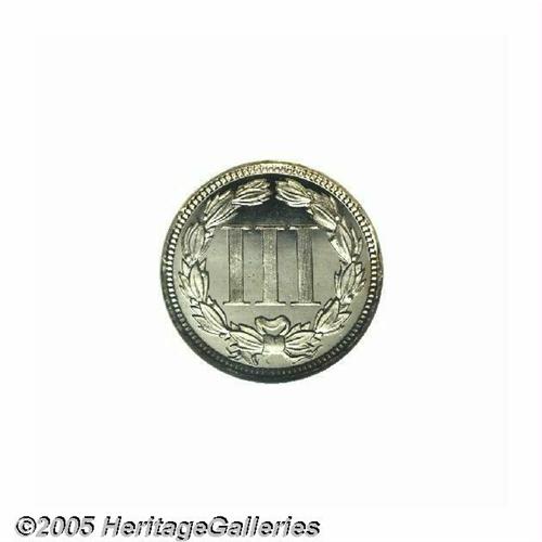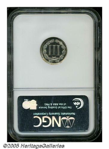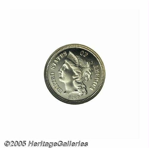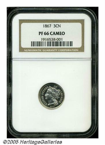 <B>1867<3CN> PR66 Cameo NGC.</B></I> Nicely contrasted with bright, watery mirrors. Only a few flecks of carbon on the obverse rule out a Superb classification. The proof mintage of the 1867, just 625+ pieces, is one of the lowest in the series. Population: 15 in 66 Cameo, 3 finer (6/05).