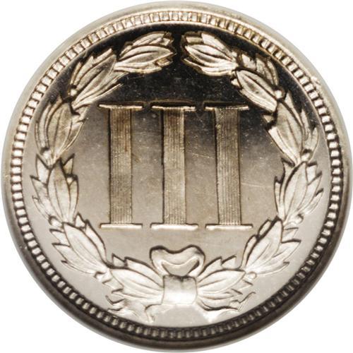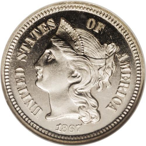 <B>1867<3CN> PR66 Cameo NGC.</B></I> One of several examples of this low mintage proof issue. This is a sparkling, brilliant coin that has flashy fields that provide sharp contrast against the moderately frosted fields. An impressive and essentially flawless proof. Census: 18 in 66, 3 finer (4/06).