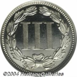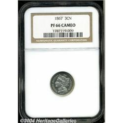 <B>1867<3CN> PR66 Cameo NGC.</B></I> A sharp cameo contrast, perhaps a bit more so on the reverse. The bright, pristine surfaces are covered in a thin veneer of light creamy toning, and the design elements reveal a crisp strike. Population: 12 in 66, 3 finer (7/04). <BR><BR><B>Important notice:</B> Heritage usually auctions material at the rate of 200-250 lots per hour. On some occasions eBay Live bid software or the Internet may not be able to keep up with the pace of the auction. We recommend placing a realistic absentee bid now as insurance to avoid disappointment. Occasionally the auctioneer may eliminate or reject an eBay Live bid, and the auctioneer may also reopen a lot after the close of the eBay live bidding (usually because we missed an audience bid), and may reject your bid even if it shows you as the winning bidder. By bidding via eBay Live, you agree that Heritage may award the lot to another bidder at its sole discretion under the circumstances described above or any other reasonable circumstances. Since eBay bids are not shown to us until we open the lot on the floor, we treat those bids just like floor bids. In most cases the floor responds before the eBay bid is presented to us, due to Internet lag time, so for consistency we have made it a policy that floor bids are always considered first over tie eBay live bids. Also please note that all Heritage lots purchased through eBay Live carry a 20% Buyer's Premium. Please make sure you read the Terms and Conditions before you bid. </span></font></tr></table></td></tr></table>