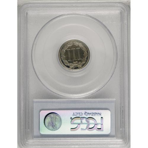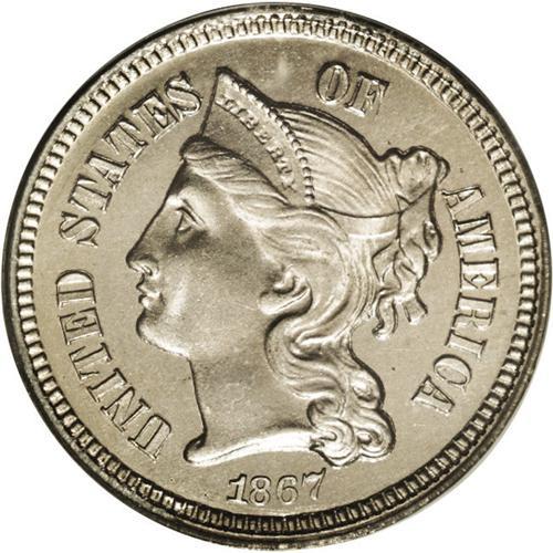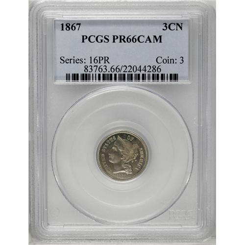 <B>1867<3CN> PR66 Cameo PCGS.</B></I> A beautiful Premium Gem proof example with excellent contrast. The surfaces have pleasing light gray color with faint gold and iridescent toning. All of the design elements are boldly defined. This example is tied for the finest Cameo proof certified by PCGS. Population: 15 in 66, 0 finer (4/06).