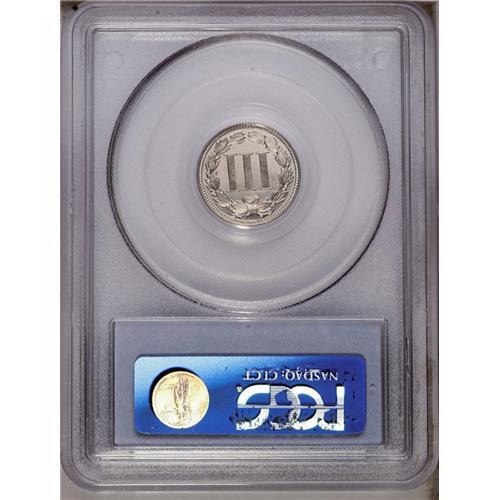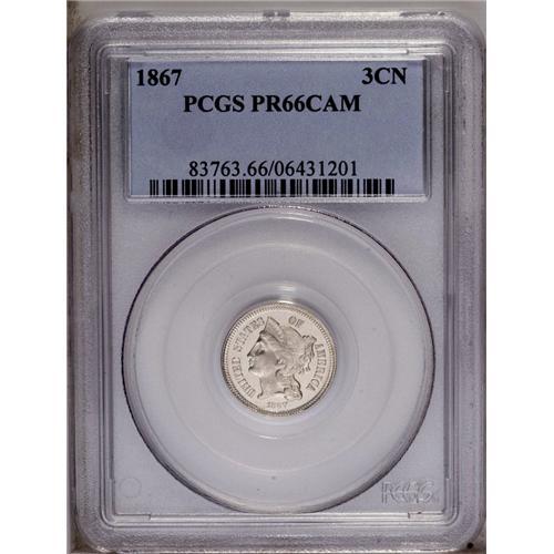 <B>1867<3CN> PR66 Cameo PCGS.</B></I> The 1867 three cent nickel is always of interest to collectors as only 625 or so proofs were struck, which is one of the lowest production runs in the series. This is a high quality example that has deeply mirrored, flashy fields with noticeably frosted devices. Brilliant throughout; magnification shows a few tiny lint marks, especially on the reverse, but the most obvious one is in the left obverse field in front of the tip of Liberty's nose. Population: 15 in 66, 0 finer (3/06). <BR><BR><B>Important notice:</B> Heritage usually auctions material at the rate of 200-250 lots per hour. On some occasions eBay Live bid software or the Internet may not be able to keep up with the pace of the auction. We recommend placing a realistic absentee bid now as insurance to avoid disappointment. Occasionally the auctioneer may eliminate or reject an eBay Live bid, and the auctioneer may also reopen a lot after the close of the eBay live bidding (usually because we missed an audience bid), and may reject your bid even if it shows you as the winning bidder. By bidding via eBay Live, you agree that Heritage may award the lot to another bidder at its sole discretion under the circumstances described above or any other reasonable circumstances. Since eBay bids are not shown to us until we open the lot on the floor, we treat those bids just like floor bids. In most cases the floor responds before the eBay bid is presented to us, due to Internet lag time, so for consistency we have made it a policy that floor bids are always considered first over tie eBay live bids. Also please note that all Heritage lots purchased through eBay Live carry a 20% Buyer's Premium. Please make sure you read the Terms and Conditions before you bid. This lot is being auctioned in conjunction with a live floor auction by Heritage Galleries & Auctioneers. All final auction and invoice information will be supplied by Heritage Galleries & Auctioneers, and all other information should be considered preliminary. Lot:796 <BR><BR><B>Winning Notification and Billing:</B> After the FINAL session in this auction is complete, Heritage will send e-mail and snail mail invoices. This process normally takes several days. All final auction and invoice information will be supplied by Heritage Galleries & Auctioneers, and all other information should be considered preliminary. <BR><BR>This auction will be conducted on a live auction floor and over the Internet through eBay Live. If you choose to place an absentee bid, please take a moment to <font color='#0000ff'><u><a href='http://pages.ebay.com/liveauctions/help/before/laabsentee.html'>learn how eBay Live absentee bidding works</a></u></font><font color='#000000'>