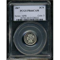 <table><tr><td><TABLE cellSpacing=0 cellPadding=0 width="100%" bgColor=#000000 border=0><TBODY> <TR><TD width="100%"><TABLE cellSpacing=1 cellPadding=3 width="100%" border=0><TBODY><TR><TD width="100%" bgColor=#79735c><FONT face=arial color=#ffffff size=3><B>Description</B> </FONT></TD></TR><TR><TD width="100%" bgColor=#ffffff><FONT face=arial size=2><B>1867 3CN PR66 Cameo PCGS.</B></I> The 1867 has one of the lowest mintages in proof format in the entire series with only 625 pieces struck. This is certainly one of the finest examples known with dazzling, deeply mirrored fields and thickly frosted devices that provide a sharp cameo contrast on each side. An outstanding proof striking. Population: 8 in 66, 0 finer (10/03). </FONT></TD></TR></TBODY></TABLE></TD></TR></TBODY></TABLE><BR><A name=PricesRealized></A><TABLE cellSpacing=0 cellPadding=0 width="100%" bgColor=#000000 border=0><TBODY><TR><TD width="100%"><TABLE cellSpacing=1 cellPadding=3 width="100%" border=0><TBODY><TR><TD width="100%" bgColor=#79735c><A name=PR><FONT face=arial color=#ffffff size=3><B>Previous Prices from Heritage Auctions</B> </FONT></A></TD></TR><TR><TD bgColor=#f6f6ed><TABLE cellSpacing=0 cellPadding=0 width="100%" border=1><TBODY><TR><TD align=middle width="33%"><B>Date</B></TD><TD align=middle width="33%"><B>Service</B></TD><TD align=middle width="33%"><B>Price</B></TD></TR><TR bgColor=whitesmoke><TD width="33%"><B>02/18/2003</B></TD><TD width="33%">NGC</TD><TD width="33%">$2,415.00</TD></TR><TR bgColor=whitesmoke><TD width="33%"><B>10/16/2001</B></TD><TD width="33%">PCGS</TD><TD width="33%">$2,400.00</TD></TR><TR bgColor=whitesmoke><TD width="33%"><B>06/05/2001</B></TD><TD width="33%">NGC</TD><TD width="33%">$1,902.00</TD></TR><TR bgColor=whitesmoke><TD width="33%"><B>09/20/2003</B></TD><TD width="33%">NGC</TD><TD width="33%">$2,400.05</TD></TR><TR bgColor=whitesmoke><TD width="33%"><B>05/31/2003</B></TD><TD width="33%">PCGS</TD><TD width="33%">$3,565.00</TD></TR><TR bgColor=whitesmoke><TD width="33%"><B>11/23/2002</B></TD><TD width="33%">NGC</TD><TD width="33%">$2,530.00</TD></TR><TR bgColor=whitesmoke><TD width="33%"><B>11/23/2002</B></TD><TD width="33%">PCGS</TD><TD width="33%">$4,485.00</TD></TR><TR bgColor=whitesmoke><TD width="33%"><B>09/28/2002</B></TD><TD width="33%">PCGS</TD><TD width="33%">$4,370.00</TD></TR><TR bgColor=whitesmoke><TD width="33%"><B>09/28/2002</B></TD><TD width="33%">NGC</TD><TD width="33%">$1,667.50</TD></TR></TBODY></TABLE></TD></TR><TR><TD bgColor=#ffffff><FONT face=arial size=1 ?>PLEASE NOTE: All prices realized reflect the final hammer price PLUS the buyer's premium in auctions that charge a buyer's premium. Each item has a notation at the top of the listing indicating whether that lot included a buyer's premium. Example: A item that sells with a final hammer price of $100 and a 20% buyer's premium will display with a price realized of $120. All information listed is intended to be as accurate as possible, but errors are possible. Please use this guide carefully and inform us of any inaccuracies. </FONT></TD></TR></TBODY></TABLE></TD></TR></TBODY></TABLE><BR><TABLE cellSpacing=0 cellPadding=0 width="100%" bgColor=#000000 border=0><TBODY><TR><TD width="100%"><TABLE cellSpacing=1 cellPadding=3 width="100%" border=0><TBODY><TR><TD width="100%" bgColor=#79735c colSpan=6><FONT face=arial color=#ffffff size=3><B>Price Guide*</B> </FONT></TD></TR><TR bgColor=#f6f6ed><TD align=middle><B>Grade</B> </TD><TD align=middle><B>Coin World<BR>(Trends)</B> </TD><TD align=middle><B>Numismedia<BR>Retail</B> </TD><TD align=middle><B>Numismedia<BR>Wholesale</B> </TD><TD align=middle><B>Coin<BR>Universe</B> </TD><TD align=middle><B>Heritage<BR>Value Index</B> </TD></TR><TR bgColor=#ffffff><TD align=middle>65</TD><TD align=right>---</TD><TD align=right>---</TD><TD align=right>---</TD><TD align=right>$1,850.00</TD><TD align=right>$1,143.33</TD></TR><TR style="FONT-WEIGHT: bold" bgColor=#cccfdd><TD align=middle>66</TD><TD align=right>---</TD><TD align=right>---</TD><TD align=right>---</TD><TD align=right>---</TD><TD align=right>---</TD></TR><TR bgColor=#ffffff><TD align=middle>67</TD><TD align=right>---</TD><TD align=right>---</TD><TD align=right>---</TD><TD align=right>---</TD><TD align=right>---</TD></TR><TR bgColor=#ffffff><TD colSpan=6><FONT size=1>*All information listed is intended to be as accurate as possible, but errors are possible. No item may be returned or refused based on this information which is provided as a service to our customers. You should contact each pricing source directly to determine the accuracy of this information. </FONT></TD></TR></TBODY></TABLE></TD></TR></TBODY></TABLE><BR><TABLE cellSpacing=0 cellPadding=0 width="100%" bgColor=#000000 border=0><TBODY><TR><TD width="100%"><TABLE cellSpacing=1 cellPadding=3 width="100%" border=0><TBODY><TR><TD width="100%" bgColor=#79735c><FONT face=arial color=#ffffff size=3><B>Population Guide</B> </FONT></TD></TR><TR bgColor=#ffffff><TD align=middle><!-- Begin Output of Population Grid--><TABLE cellSpacing=0 cellPadding=0 width="100%" border=0><TBODY><TR><TD vAlign=center><TABLE cellSpacing=0 width="100%" border=1 cellsadding="3"><TBODY><TR><TD vAlign=center><TABLE cellSpacing=0 cellPadding=3 width="100%" border=1><TBODY><TR><TD vAlign=center align=middle bgColor=#f0f1e8 colSpan=2 <CENTER><FONT face=Arial size=2><B>PCGS Pop </B></FONT><CENTER></CENTER></TD><TD vAlign=center align=middle bgColor=#f0f1e8 colSpan=2><CENTER><FONT face=Arial size=2><B>NGC Pop</B></CENTER></FONT></TD></TR><TR><TD vAlign=center><FONT face=Arial size=2>(66)</FONT> </TD><TD vAlign=center align=right><FONT face=Arial size=2>9</FONT> </TD><TD vAlign=center><FONT face=Arial size=2>(66)</FONT> </TD><TD vAlign=center align=right><FONT face=Arial size=2>10</FONT> </TD></TR><TR><TD vAlign=center><FONT face=Arial size=2>(>66)</FONT> </TD><TD vAlign=center align=right><FONT face=Arial size=2>0</FONT> </TD><TD vAlign=center><FONT face=Arial size=2>(>66)</FONT> </TD><T