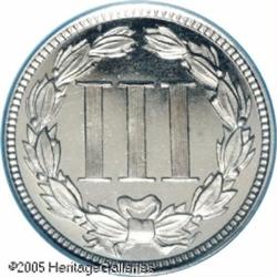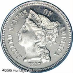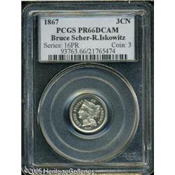 <B>1867 3CN PR66 Deep Cameo PCGS.</B></I> The 1867 is a low mintage proof from the early years of issuance. Only 625 proofs are believed to have been struck. Very few have survived today in such a superior condition as this piece, and just a handful are known with Deep Cameo contrast. PCGS and NGC have both certified only four Deep (or Ultra) Mirror coins. As such, this piece is tied with only two other PCGS coins. This is a deeply reflective coin that exhibits strong field-to-device contrast on each side. Untoned, the surfaces show only a couple of tiny lint marks on the reverse, and a very light pinscratch across the highpoint of Liberty's cheek (which is indiscernible to the unaided eye).<BR><I>From the Bruce Scher #1 All-Time PCGS Registry Set.</B></I> Lot:4027