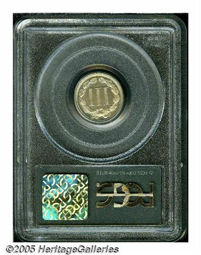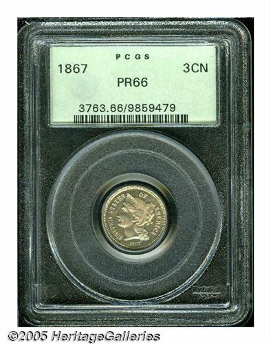 <B>1867<3CN> PR66 PCGS.</B></I> Golden haze sits over the premium Gem surfaces of this example. Nicely lustrous, the strike could be slightly stronger.
