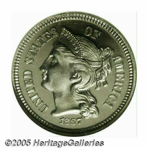 <B>1867<3CN> PR66 <S Cameo NGC.</B></I> Imposing white on black contrast and an intricate strike provide the eye appeal of this fully brilliant premium Gem. The only detectable imperfections are two tiny gray spots near the top of the denominational pillars. The 7 in the date is lightly recut. A better date among proof issues, the certified population is lower than the costly proof-only 1877. Population: 3 in 66 <S Cameo, 3 finer as PR67 Cameo without a star designation (3/05).