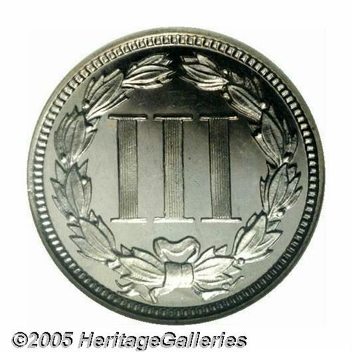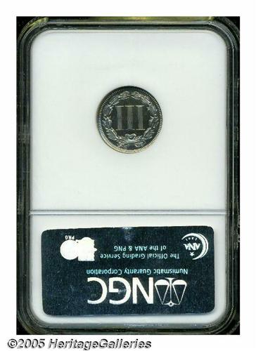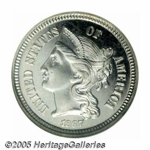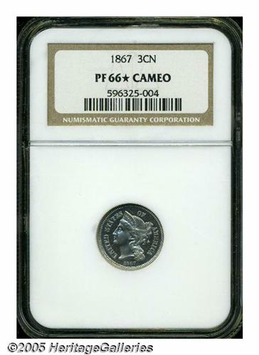 <B>1867<3CN> PR66 <S Cameo NGC.</B></I> Pastel powder-blue and canary-gold hues enliven this reasonably struck premium Gem, which is noteworthy for its undeniable white on black contrast. Business strikes and proofs take opposite courses for the Three Cent Nickel type; the early date proofs are the toughest, while the late date business strikes are generally the most elusive.