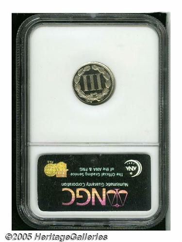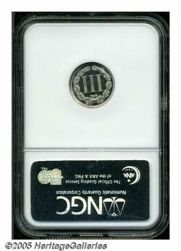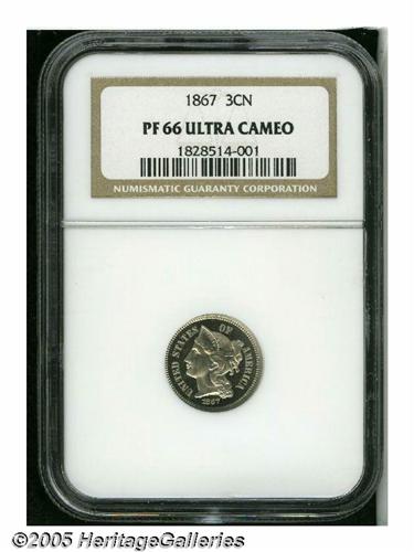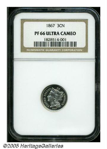 <B>1867<3CN> PR66 Ultra Cameo NGC.</B></I> This meticulously struck premium Gem possesses exceptional white on black contrast on both sides, uncommon among early proofs. Void of contact and nearly brilliant, although an occasional pinpoint toning fleck is noted. Although business strikes are common, the 1867 is much scarcer as a proof than all post-1877 issues. Population: 3 in 66 Ultra Cameo, none finer (5/05).