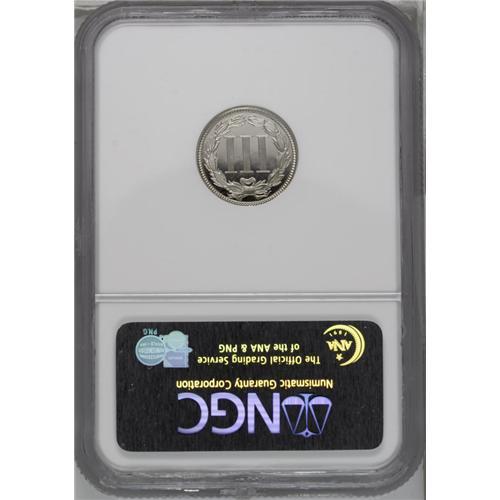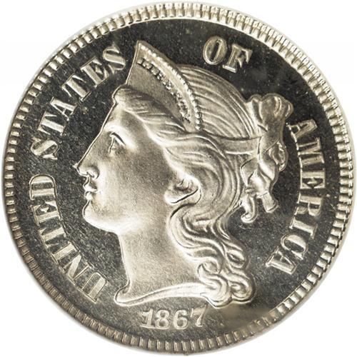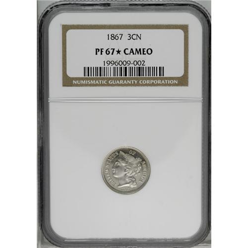 <B>1867<3CN> PR67 <img border='0' src='http://www.heritagecoins.com/images/star.gif' width=10 height=10> Cameo NGC.</B></I> Deeply mirrored with uncommonly stark contrast for this scarcer early date proof. The surfaces are untoned and, as the star indicates, are notable for their outstanding eye appeal. Census: 2 in 67 <img border='0' src='http://www.heritagecoins.com/images/star.gif' width=10 height=10>, 0 finer (3/06). <BR><BR><B>Important notice:</B> Heritage usually auctions material at the rate of 200-250 lots per hour. On some occasions eBay Live bid software or the Internet may not be able to keep up with the pace of the auction. We recommend placing a realistic absentee bid now as insurance to avoid disappointment. Occasionally the auctioneer may eliminate or reject an eBay Live bid, and the auctioneer may also reopen a lot after the close of the eBay live bidding (usually because we missed an audience bid), and may reject your bid even if it shows you as the winning bidder. By bidding via eBay Live, you agree that Heritage may award the lot to another bidder at its sole discretion under the circumstances described above or any other reasonable circumstances. Since eBay bids are not shown to us until we open the lot on the floor, we treat those bids just like floor bids. In most cases the floor responds before the eBay bid is presented to us, due to Internet lag time, so for consistency we have made it a policy that floor bids are always considered first over tie eBay live bids. Also please note that all Heritage lots purchased through eBay Live carry a 20% Buyer's Premium. Please make sure you read the Terms and Conditions before you bid. This lot is being auctioned in conjunction with a live floor auction by Heritage Galleries & Auctioneers. All final auction and invoice information will be supplied by Heritage Galleries & Auctioneers, and all other information should be considered preliminary. Lot:798 <BR><BR><B>Winning Notification and Billing:</B> After the FINAL session in this auction is complete, Heritage will send e-mail and snail mail invoices. This process normally takes several days. All final auction and invoice information will be supplied by Heritage Galleries & Auctioneers, and all other information should be considered preliminary. <BR><BR>This auction will be conducted on a live auction floor and over the Internet through eBay Live. If you choose to place an absentee bid, please take a moment to <font color='#0000ff'><u><a href='http://pages.ebay.com/liveauctions/help/before/laabsentee.html'>learn how eBay Live absentee bidding works</a></u></font><font color='#000000'>