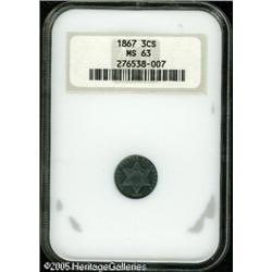 <B>1867 3CS MS63 NGC.</B></I> Deep cobalt-blue toning covers each side with a large area of purple toning on the lower portion of the reverse. Sharply struck. Lot:5666