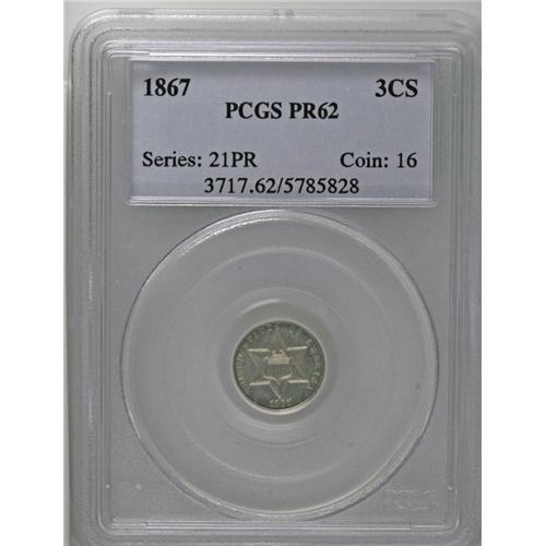 1867 3CS PR62 PCGS. A moderately reflective trime that