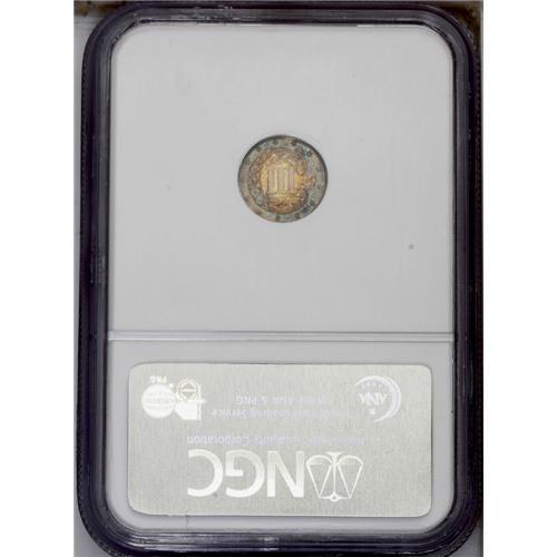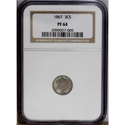 <B>1867<3CS> PR64 NGC.</B></I> A wholly original, near-Gem specimen that is cloaked in intermingled hues of steel-blue, apricot, and rose toning. Survivors, while generally well preserved, are few in number, as could be predicted by its modest mintage of 625 proofs. <BR><BR><B>Important notice:</B> Heritage usually auctions material at the rate of 200-250 lots per hour. On some occasions eBay Live bid software or the Internet may not be able to keep up with the pace of the auction. We recommend placing a realistic absentee bid now as insurance to avoid disappointment. Occasionally the auctioneer may eliminate or reject an eBay Live bid, and the auctioneer may also reopen a lot after the close of the eBay live bidding (usually because we missed an audience bid), and may reject your bid even if it shows you as the winning bidder. By bidding via eBay Live, you agree that Heritage may award the lot to another bidder at its sole discretion under the circumstances described above or any other reasonable circumstances. Since eBay bids are not shown to us until we open the lot on the floor, we treat those bids just like floor bids. In most cases the floor responds before the eBay bid is presented to us, due to Internet lag time, so for consistency we have made it a policy that floor bids are always considered first over tie eBay live bids. Also please note that all Heritage lots purchased through eBay Live carry a 20% Buyer's Premium. Please make sure you read the Terms and Conditions before you bid. This lot is being auctioned in conjunction with a live floor auction by Heritage Galleries & Auctioneers. All final auction and invoice information will be supplied by Heritage Galleries & Auctioneers, and all other information should be considered preliminary. Lot:772 <BR><BR><B>Winning Notification and Billing:</B> After the FINAL session in this auction is complete, Heritage will send e-mail and snail mail invoices. This process normally takes several days. All final auction and invoice information will be supplied by Heritage Galleries & Auctioneers, and all other information should be considered preliminary. <BR><BR>This auction will be conducted on a live auction floor and over the Internet through eBay Live. If you choose to place an absentee bid, please take a moment to <font color='#0000ff'><u><a href='http://pages.ebay.com/liveauctions/help/before/laabsentee.html'>learn how eBay Live absentee bidding works</a></u></font><font color='#000000'>