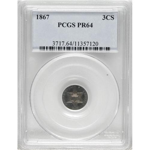 <B>1867 3CS PR64 PCGS.</B></I> Deep blue-green patina graces the watery mirrors of this near-Gem. The surfaces are nearly contact-free, though the fields display a few light hairlines. An attractive example of this post-war issue, one of 625 proofs coined.<BR><BR><b>Shipping:</b> Coins & Currency (<a target="_blank" href="http://www.heritageauctions.com/common/shipping.php">view shipping information</a>)