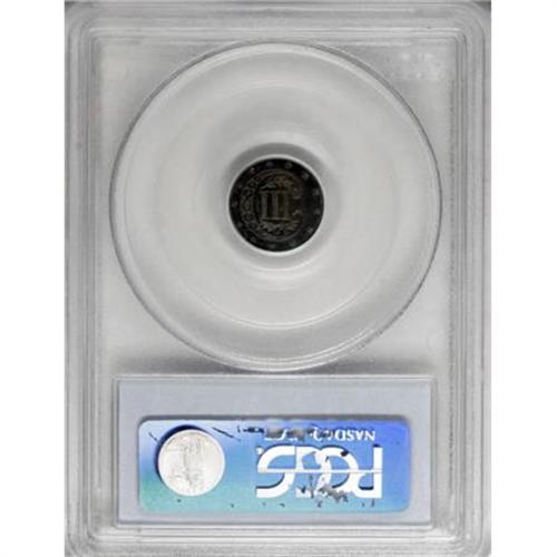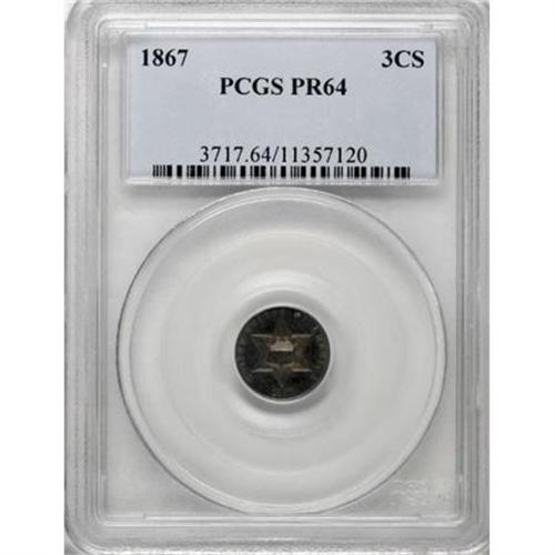 <B>1867 3CS PR64 PCGS.</B></I> Deep blue-green patina graces the watery mirrors of this near-Gem. The surfaces are pleasingly preserved save for a handful of faint hairlines in the fields. Immensely appealing for this proof issue of just 625 pieces.<BR><BR><B>Coin Engraver:</B> James B. Longacre<BR><BR><b>Shipping:</b> Coins & Currency (<a target="_blank" href="http://www.heritageauctions.com/common/shipping.php">view shipping information</a>)