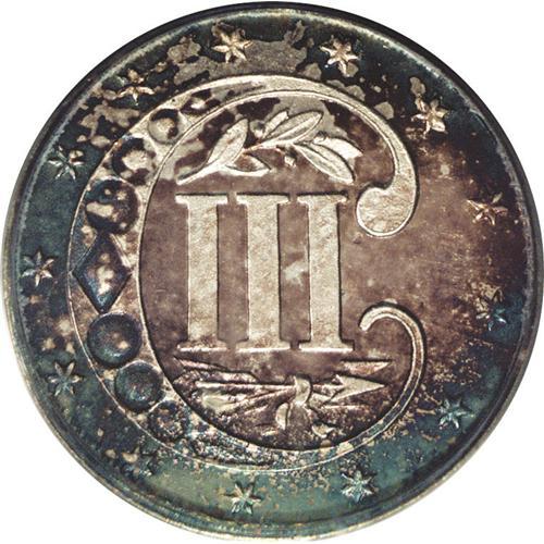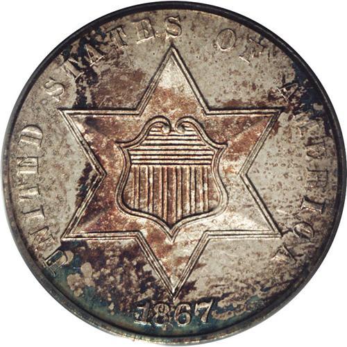<B>1867<3CS> PR65 Cameo PCGS.</B></I> This is the usual Normal Date variety. In addition, proofs and business strikes are also known with a doubled date. In fact, Breen noted that most examples of the normal date variety are actually late die states of the doubled date, although that does not seem to be the case here. A splendid Gem Cameo proof with intermingled iridescent toning over reflective surfaces, vivid blue dominating the reverse. The devices are fully lustrous on both sides.