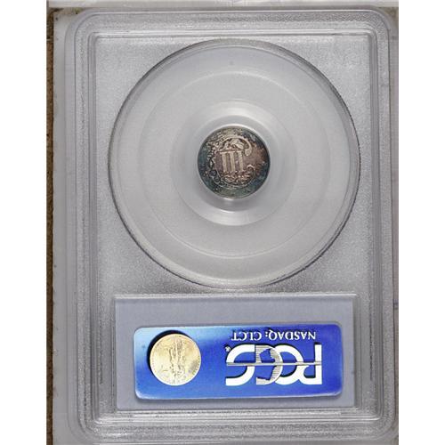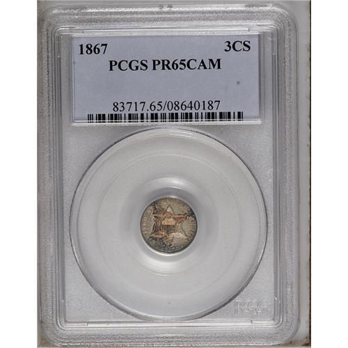<B>1867<3CS> PR65 Cameo PCGS.</B></I> This is the usual Normal Date variety. In addition, proofs and business strikes are also known with a doubled date. In fact, Breen noted that most examples of the normal date variety are actually late die states of the doubled date, although that does not seem to be the case here. A splendid Gem Cameo proof with intermingled iridescent toning over reflective surfaces, vivid blue dominating the reverse. The devices are fully lustrous on both sides.