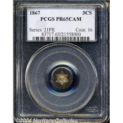 <B>1867<3CS> PR65 Cameo PCGS.</B></I> A lightening of vivid turquoise and burnt-orange toning in the centers enables the contrast to be abundantly clear. One extremely flashy proof trime. Population: 3 in 65 Cameo, 4 finer (4/04). <BR><BR><B>Important notice:</B> Heritage usually auctions material at the rate of 200-250 lots per hour. On some occasions eBay Live bid software or the Internet may not be able to keep up with the pace of the auction. We recommend placing a realistic absentee bid now as insurance to avoid disappointment. Occasionally the auctioneer may eliminate or reject an eBay Live bid, and the auctioneer may also reopen a lot after the close of the eBay live bidding (usually because we missed an audience bid), and may reject your bid even if it shows you as the winning bidder. By bidding via eBay Live, you agree that Heritage may award the lot to another bidder at its sole discretion under the circumstances described above or any other reasonable circumstances. Since eBay bids are not shown to us until we open the lot on the floor, we treat those bids just like floor bids. In most cases the floor responds before the eBay bid is presented to us, due to Internet lag time, so for consistency we have made it a policy that floor bids are always considered first over tie eBay live bids. Also please note that all Heritage lots purchased through eBay Live carry a 20% Buyer's Premium. Please make sure you read the Terms and Conditions before you bid.