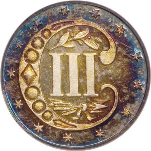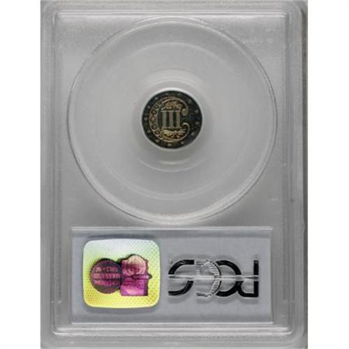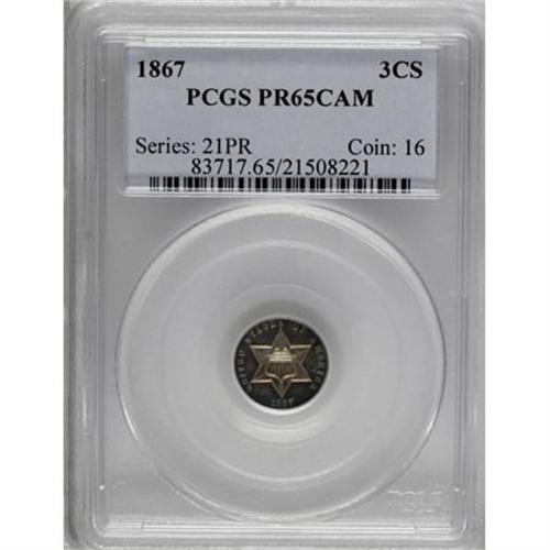 <B>1867 3CS PR65 Cameo PCGS.</B></I> Not only do the technical merits of this spectacular little cameo place it among the more elite survivors from all already low mintage of 625 proofs, the coin's colorful toning gives it equally impressive aesthetic appeal. Both sides are framed in memorable shades of cobalt-blue and violet iridescence. Population: 7 in 65 Cameo, 6 finer (6/07).<BR><BR><b>Shipping:</b> Coins & Currency (<a target="_blank" href="http://www.heritageauctions.com/common/shipping.php">view shipping information</a>\)